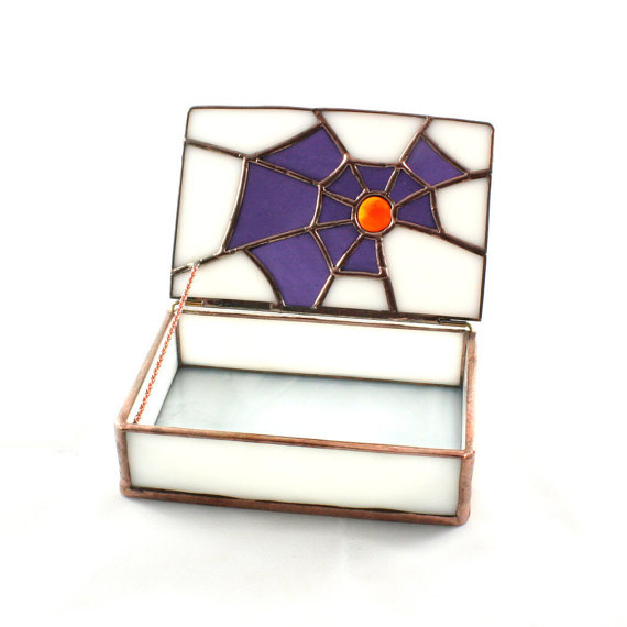 Lastly, The Spider Web Box is another very simple but very cool box. The amber gem on the very top surrounded by beautiful violet glass creates an almost supernatural glow. It is about 5″ x 3.5″ x 1″. The spider web design on the top will draw anyone’s attention.