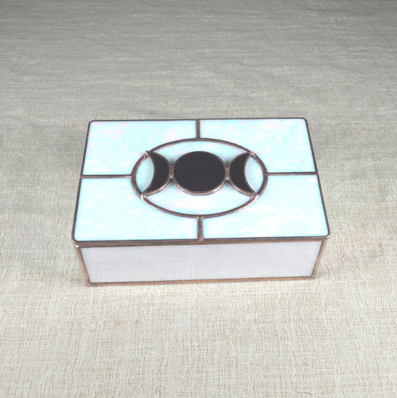 The The Triple Moon Tarot Box is a little larger than the pentacle box and just as gorgeous. Inside it measures about 6¼” x 4″ x 1¾”. I love the dark blue iridescent glass on the inside, but the gentle white glass surrounding it makes the whole thing pop. I enjoy having the moons being made of black glass instead of the typical white as well. This is definitely a favorite!