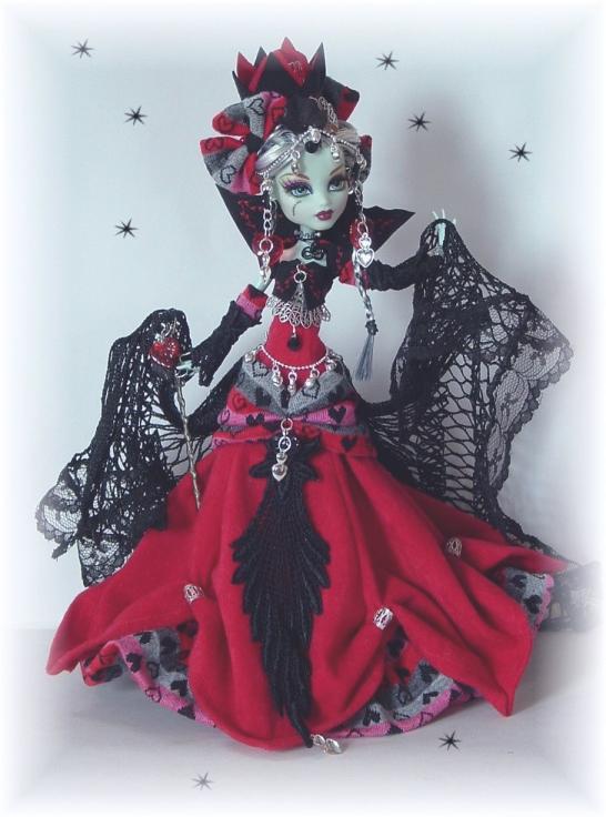 Monster High “Frankie Stein” doll until she was repurposed. Not much has been done to the doll’s face or body in terms of repaint or alterations, but her outfit has been custom sewn. She also features lots of custom jewelry and an intricate headpiece. I love her bat wing cape!