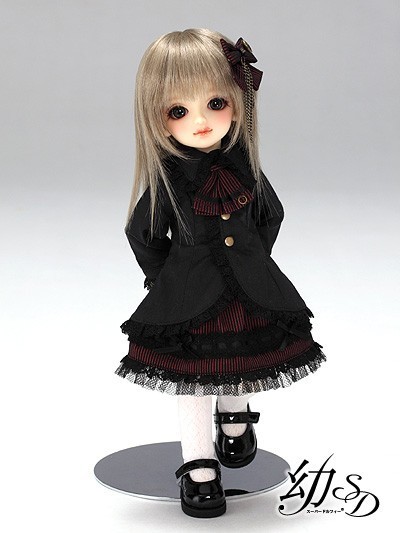 Volks Dolpa from afar. She’s dressed in a lacy black and burgundy Gothic Lolita dress, with tiny black patent shoes, brass colored buttons and a bow in her hair.