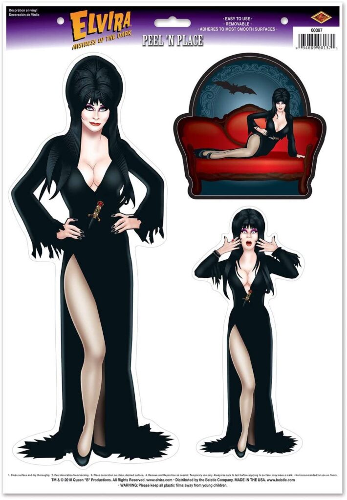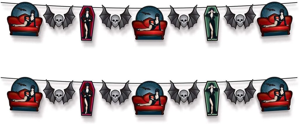 Beistle’s Elvira Halloween decorations (via Amazon; affiliate link) are inexpensive and require just a little bit of folding and assembly.