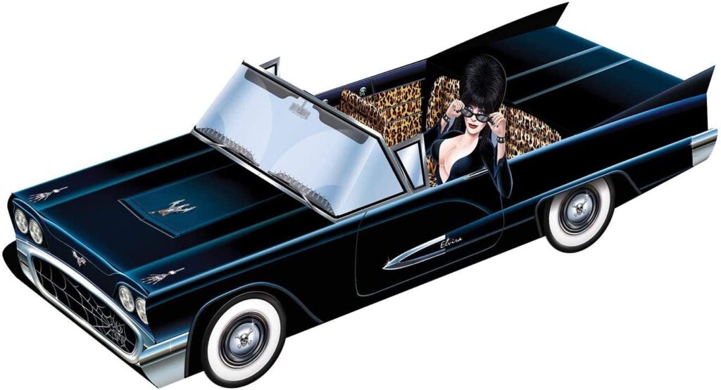 This paper centerpiece shows Elvira in her Macabre Mobile, a 1959 Ford Thunderbird.