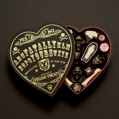 This company is making a Fatally Yours gourmet chocolate box. First of all, for those who have food allergies, this is totally vegan. I know some of you might cringe, but seriously vegan chocolate is delicious. There are so many flavors that come with this box of ghoulishly designed Valentine’s Day chocolate.