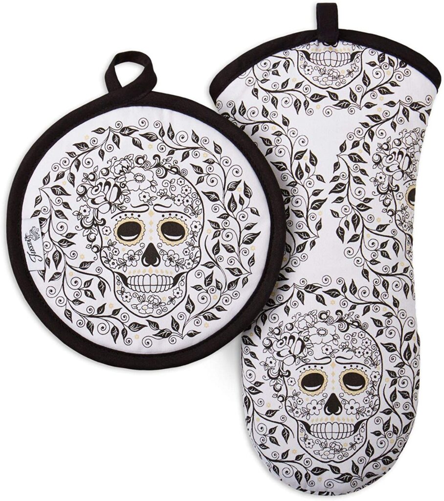 Take a look at Fiesta’s (the dinnerware company) sugar skull themed pot holders and matching oven mitts!