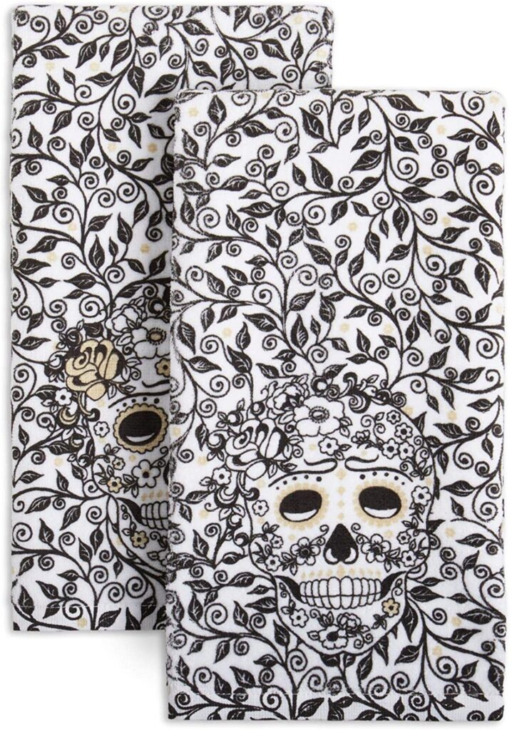 Fiesta also came out with matching Skull & Vine kitchen towels. They’re cotton, exactly the kind I like for drying my hands or drying dishes. The kitchen towels also come in colorful sugar skulls or black and white!