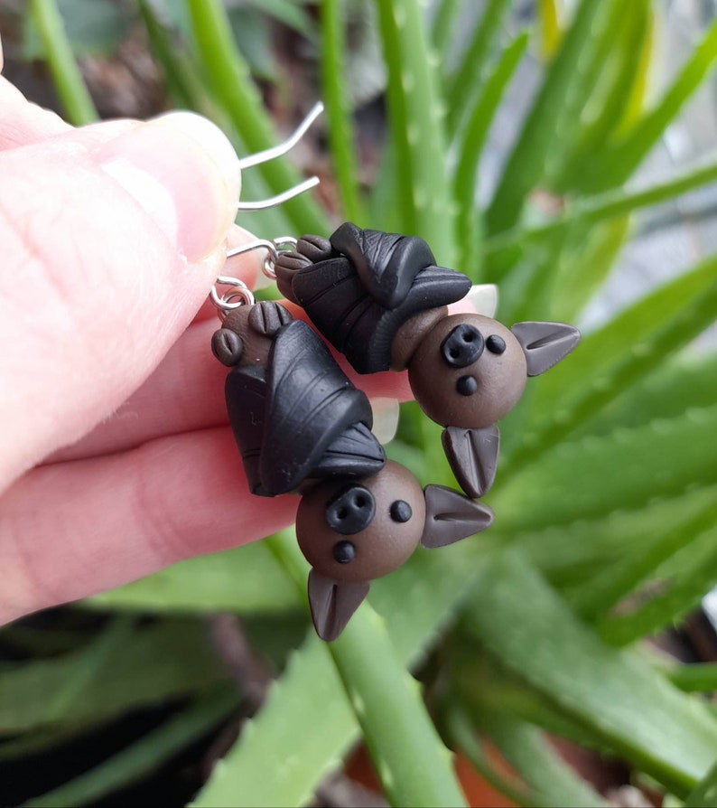 These brown bat dangle earrings are from the Titaniagems shop on Etsy. They’re made with polymer clay and your choice of silver or surgical steel ear wires.